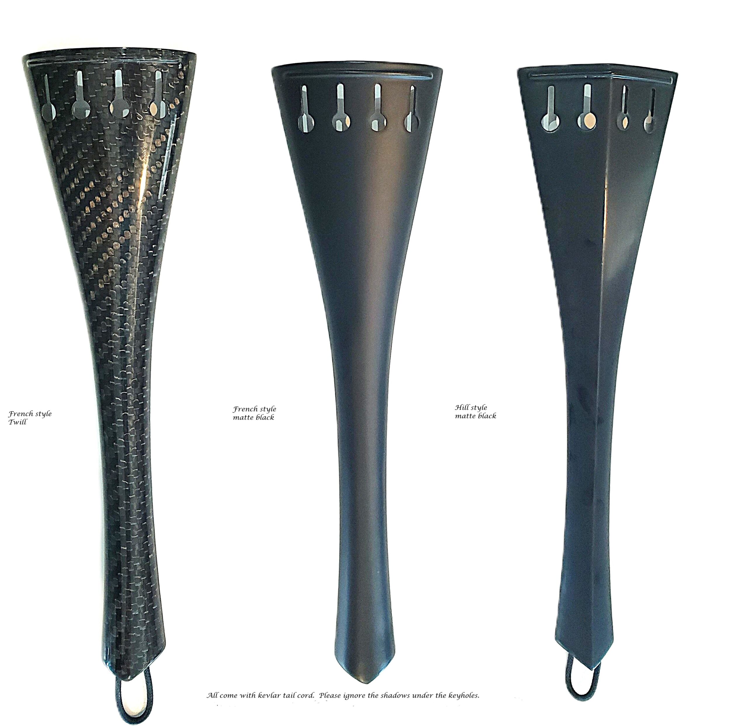 ConCarbo carbon fiber tailpieces come in a few styles and finishes. This is the French style twill which displays the CF weave; it is also available in matte or glossy black. It comes with a kevlar tail cord. If you have Pegheds and don’t need fine tuners, this is a great choice. If you do need fine tuners, there are two options pictured in the gallery (mini levers and titanium adjusters) and they have their own entries and pricing on our site. For more information from the maker, visit their site here.