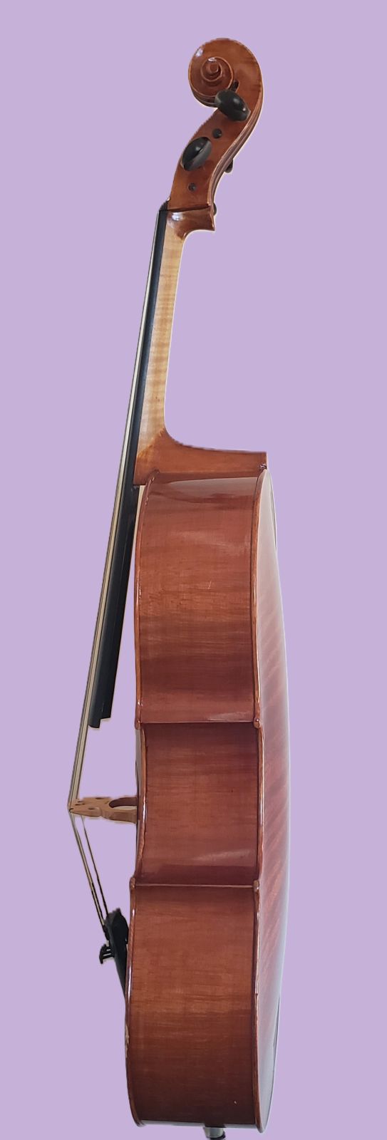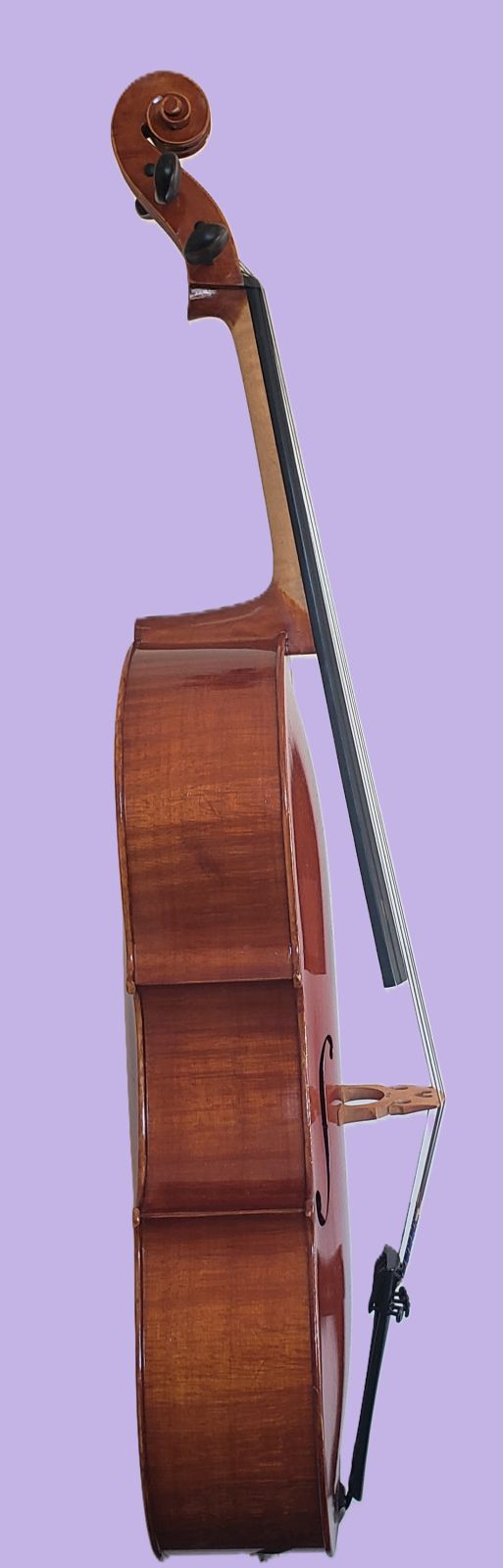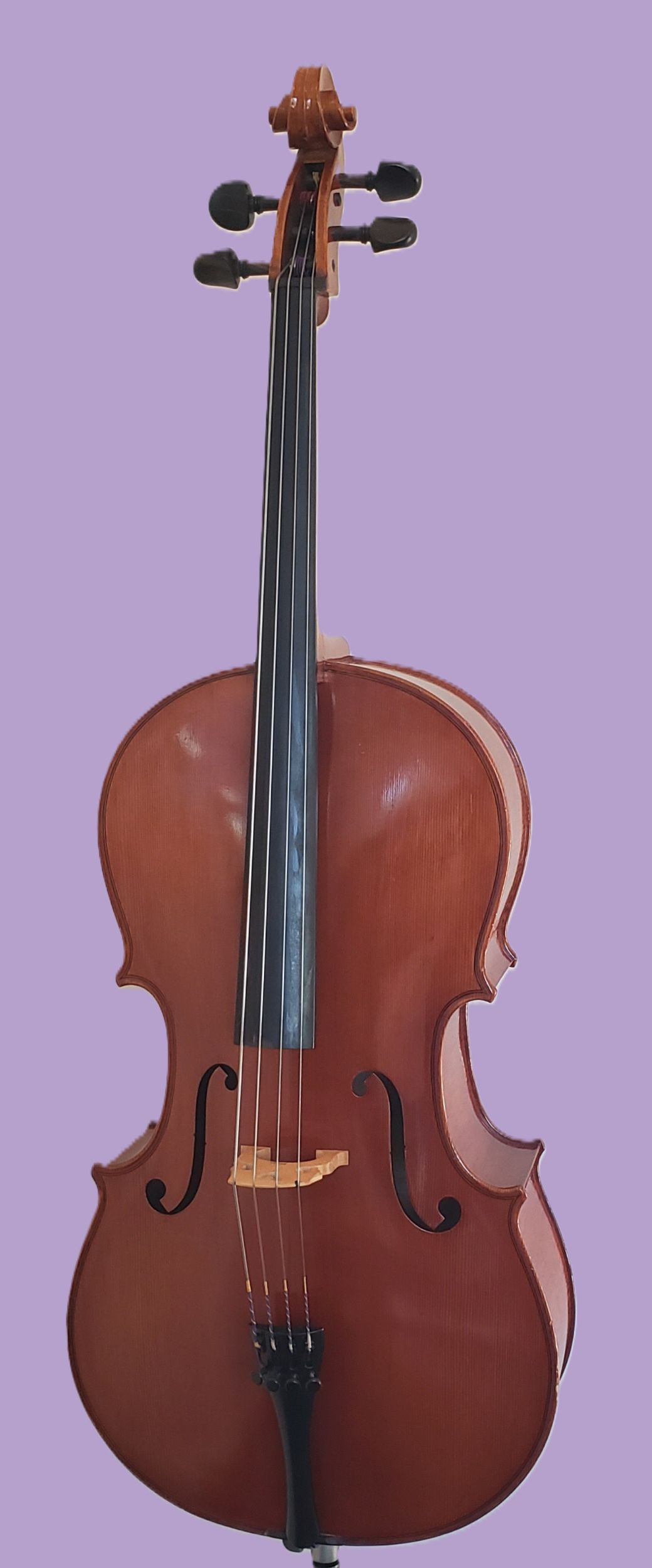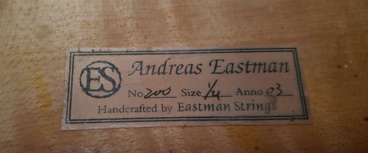 This 1/4 size Andreas Eastman cello was made in 2003 and has been in the hands of people who took very good care of it.  It is paired with an octagonal German bow stamped Jos. Martin, made of brazilwood with a full-lined ebony frog, weight ~ 66 grams.  Keeping in mind dimensions for the same “size” cello can vary with each maker and style, I can tell you this is a smaller 1/4 than some others.  The back length is 59 cm (12 1/4″), the upper bouts are 27 cm (10 5/8″), the lower bouts are 34 cm (13 5/8″) and the playable string length is 53.5 cm (21 1/8″).  It’s important to note that a narrow cello will be easier for some kids with shorter legs to get comfortable at than a wider-bottom cello .  A purple Bobelock bag completes the outfit.